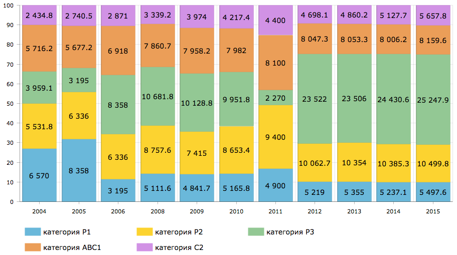 Динамика распределения запасов и ресурсов в 2004-2015 гг., тонн